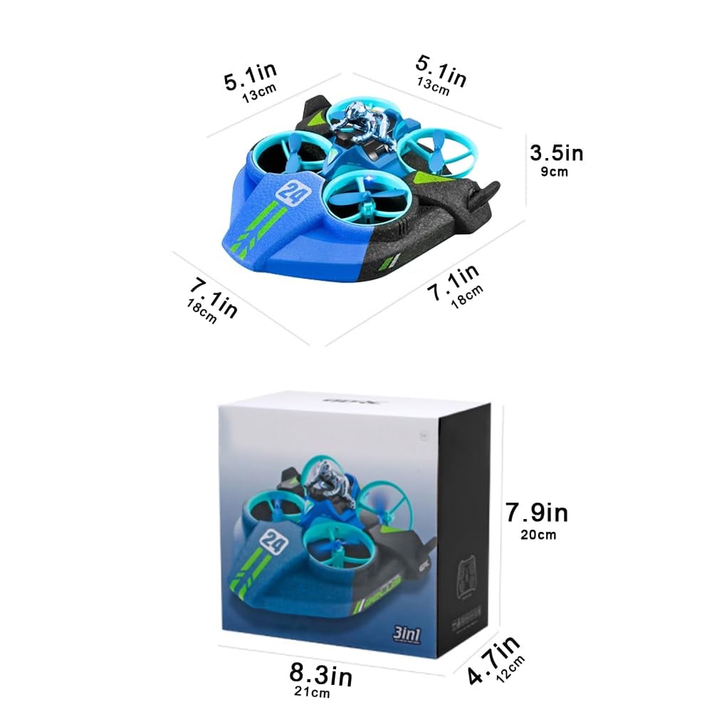 3 Driving Modes:Our RC Hovercraft Boat Drone Race Car Toy Which able to Surfing above Water Mode, Air Flying Mode(Aircraft alone) and Land Driving Mode.